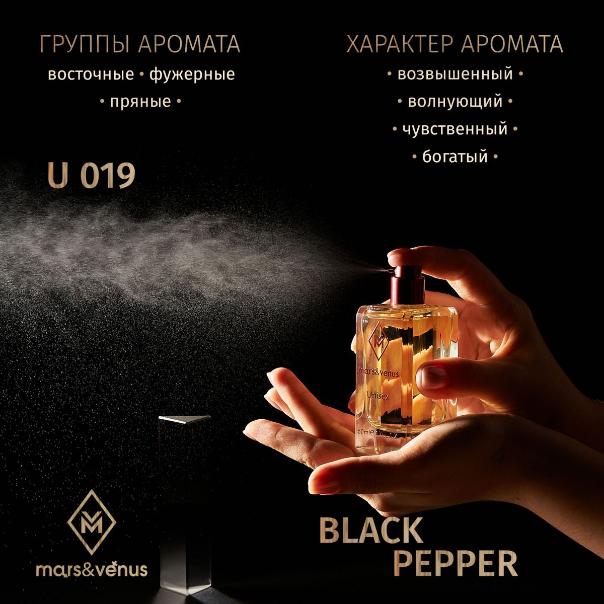 Mars-Venus U 019 Black Pepper – ароматный пряный парфюм для женщин и мужчин. Аромат очень сложен и многогранен, он представляет собой мастерски подобранную пряную смесь из множества замечательных ингредиентов, которые гармонично перекликаются друг с другом. Однако самыми отчетливыми, яркими и выраженными стали острый черный перец, загадочная и мистическая амбра и экзотическое масло нероли.