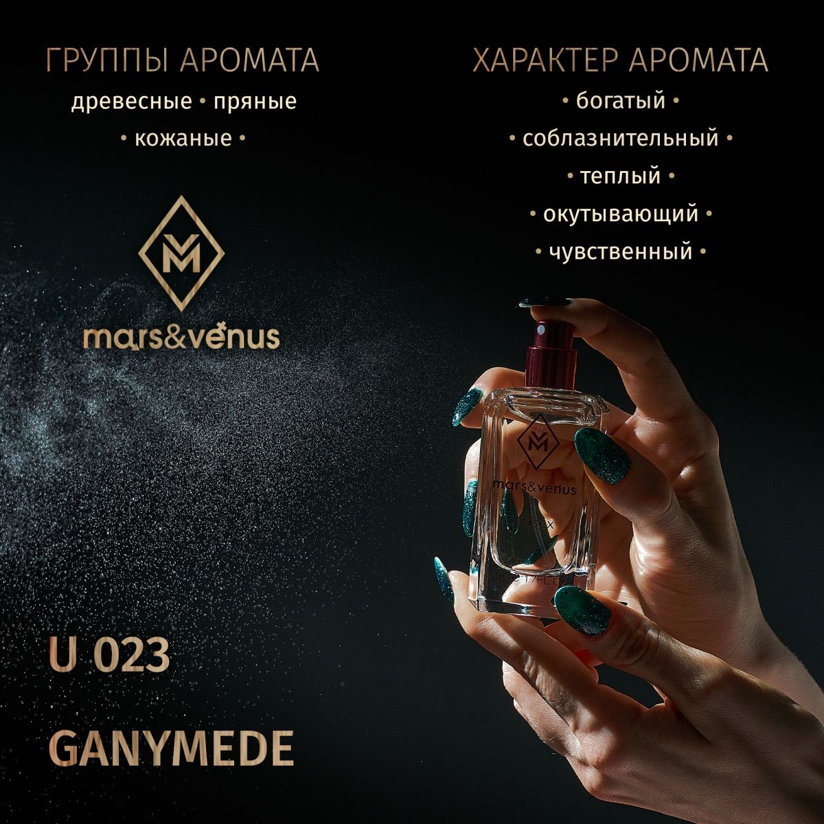 Уникальная композиция парфюмерной воды Mars-Venus U 023 Ganymede поражает своей непохожестью и непривычностью звучания, она относится к древесно-кожаным ароматам, которые одинаково хорошо звучат как на женской, так и на мужской коже. Очень тонкий, неоднозначный и многогранный аромат с противоречивым характером. Ольфакторная пирамида состоит, казалось бы, из привычных компонентов, но их сочетание настолько современно интересное, что для многих этот парфюм совершенно не раскладывается на ноты. В нём слышны замшевые акценты с фруктово-кожаными нюансами османтуса и пудровостью фиалки, а древесные, объёмные ноты бессмертника и акигалавуда добавляют ненавязчивой современности.