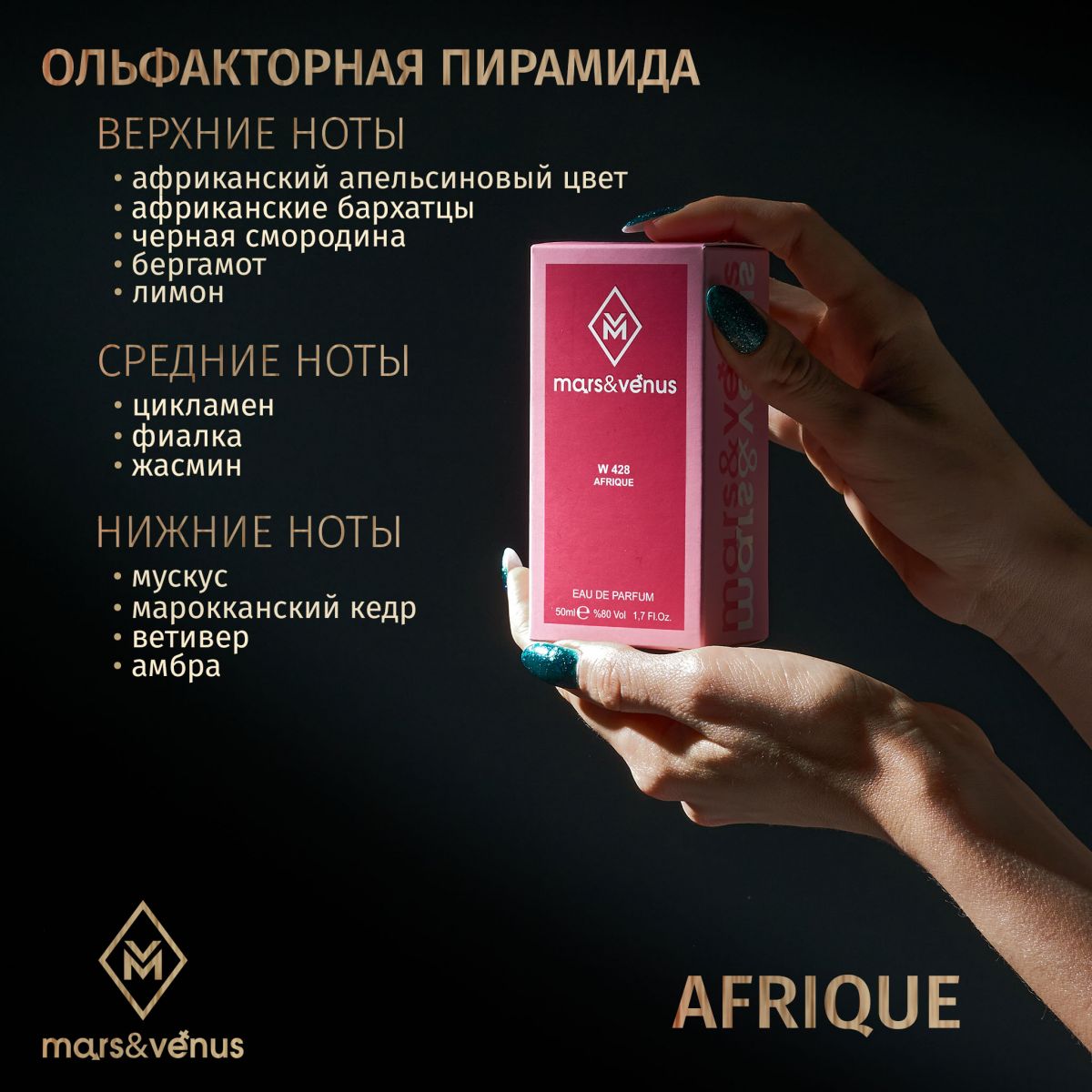 Этот парфюм – волшебный бал, который погружает Вас в неповторимую атмосферу, даря наслаждение и восторг. W 428 Mars&Venus Afrique отлично звучит при любой погоде и подходит для любых мероприятий, но всё же это весенне-летний аромат, который идеален для жарких дней, когда он полностью раскрывается своей притягательной аурой.