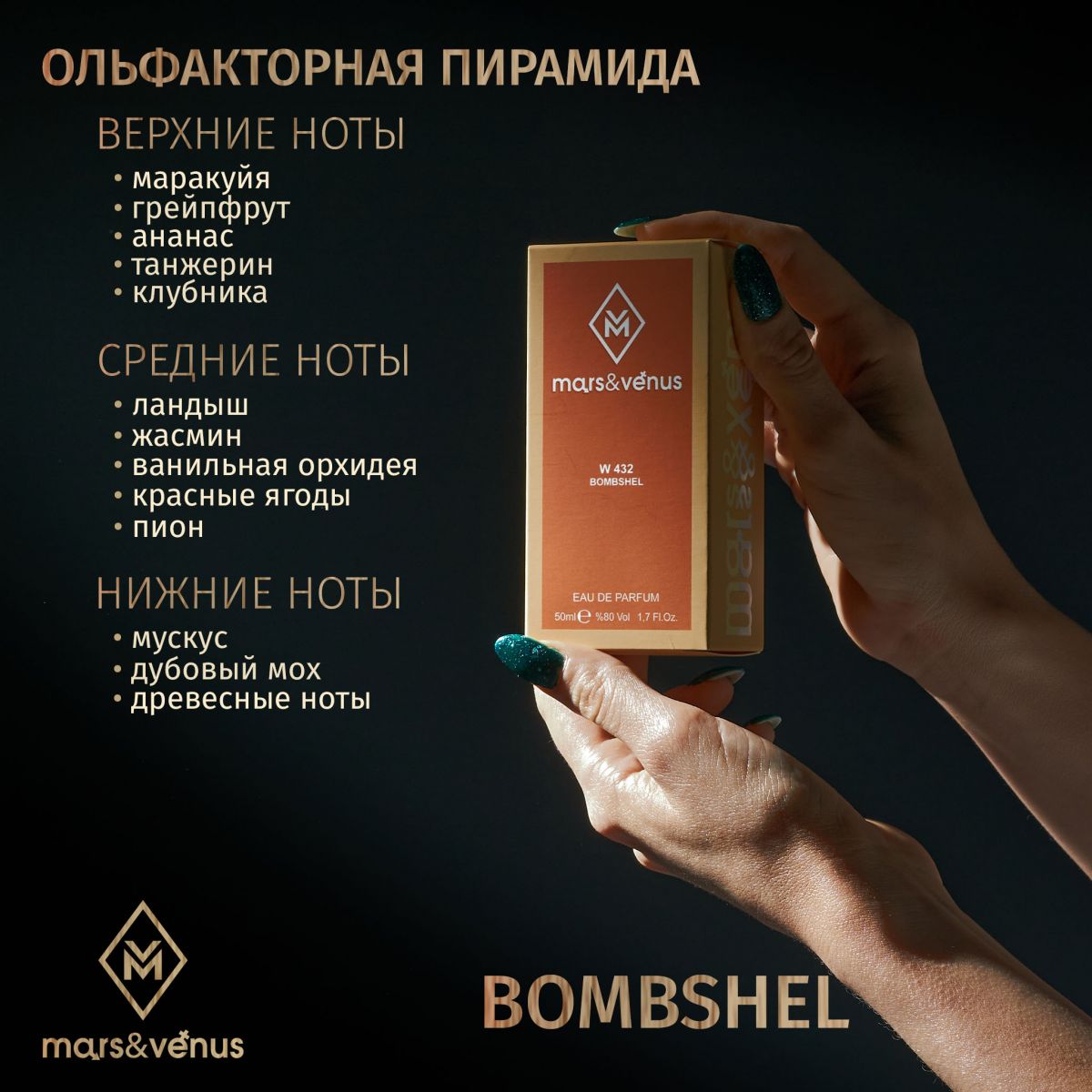 Фруктово-цветочный аромат парфюмерной воды W 432 Mars-Venus Bombshel – это парфюм, требующий внимания. Он представляет собой чарующую поэзию прикосновения природы в результате чего получился яркий, уверенный и солнечный аромат, который окутывает своей неповторимой магией и превращает каждую женщину в настоящую героиню волшебной истории. Его яркие фруктовые ноты смелы, но смягчены цветочным сердцем. Парфюмерная вода идеально подходит для уверенных в себе девушек и может послужить дополнительным зарядом энергии.